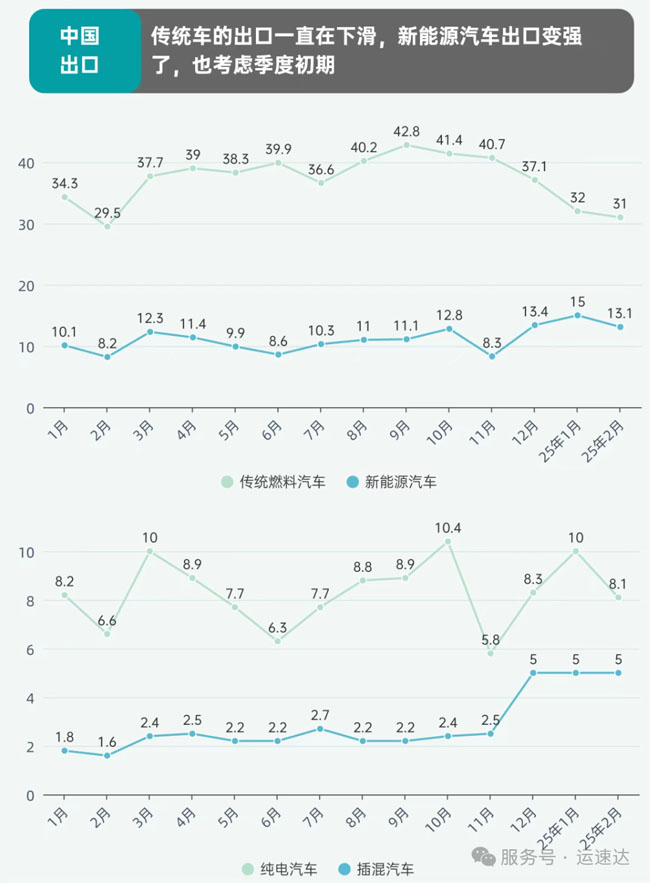 中国出口规模持续领跑 海关总署数据显示,2024年,中国汽车(包括底盘)出口量达到640.7万辆,同比增长22.8%,继续位居世界第一;电动汽车出口量首次突破200万辆。 全年汽车、汽车零配件累计出口金额分别达到1173.5亿、934.3亿美元,同比分别增长15.5%、6.6%。 数据补充: 2025年1-2月1-2月新能源汽车累计出口28.2万辆,同比增长54.5%。